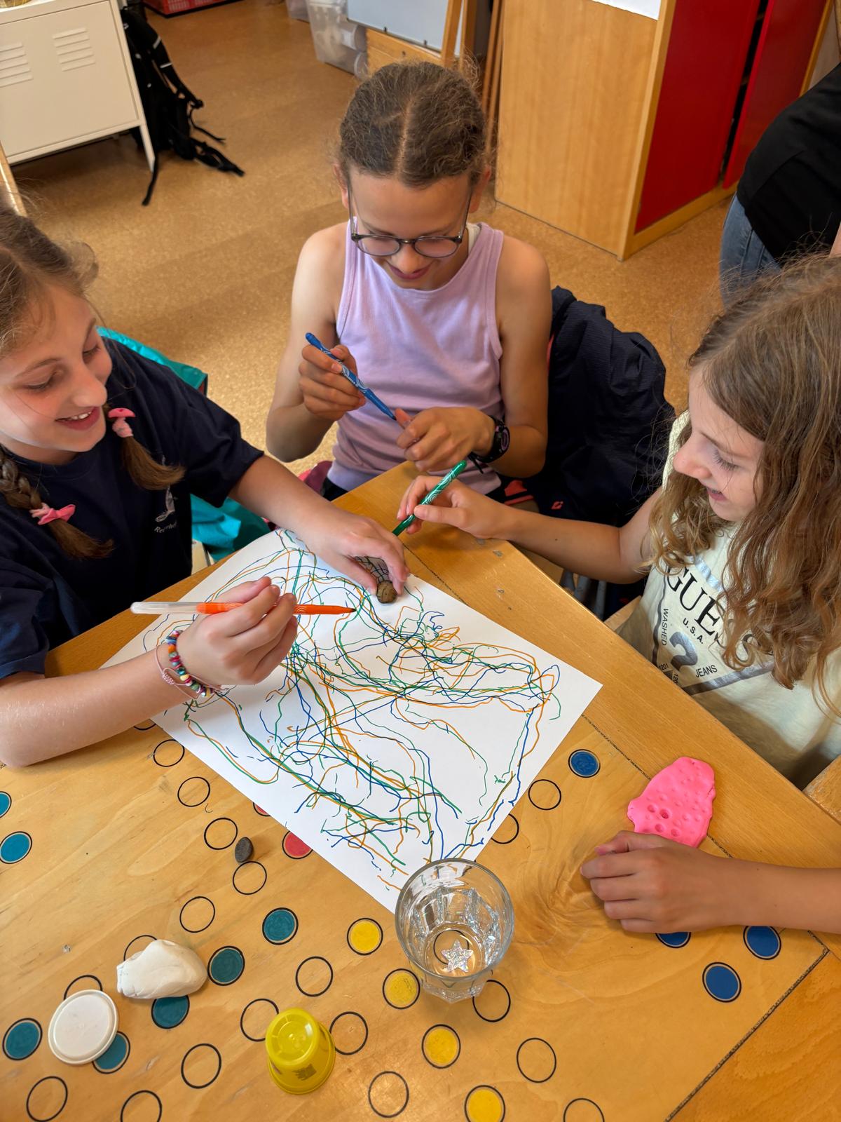 In unserem Atelier machten die Kinder interessante Erfahrungen. Mit Ölkreide erstellte Zeichnungen wurden von ihnen mit Wasserfarbe übermalt.