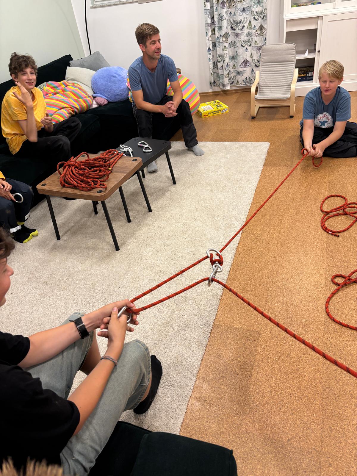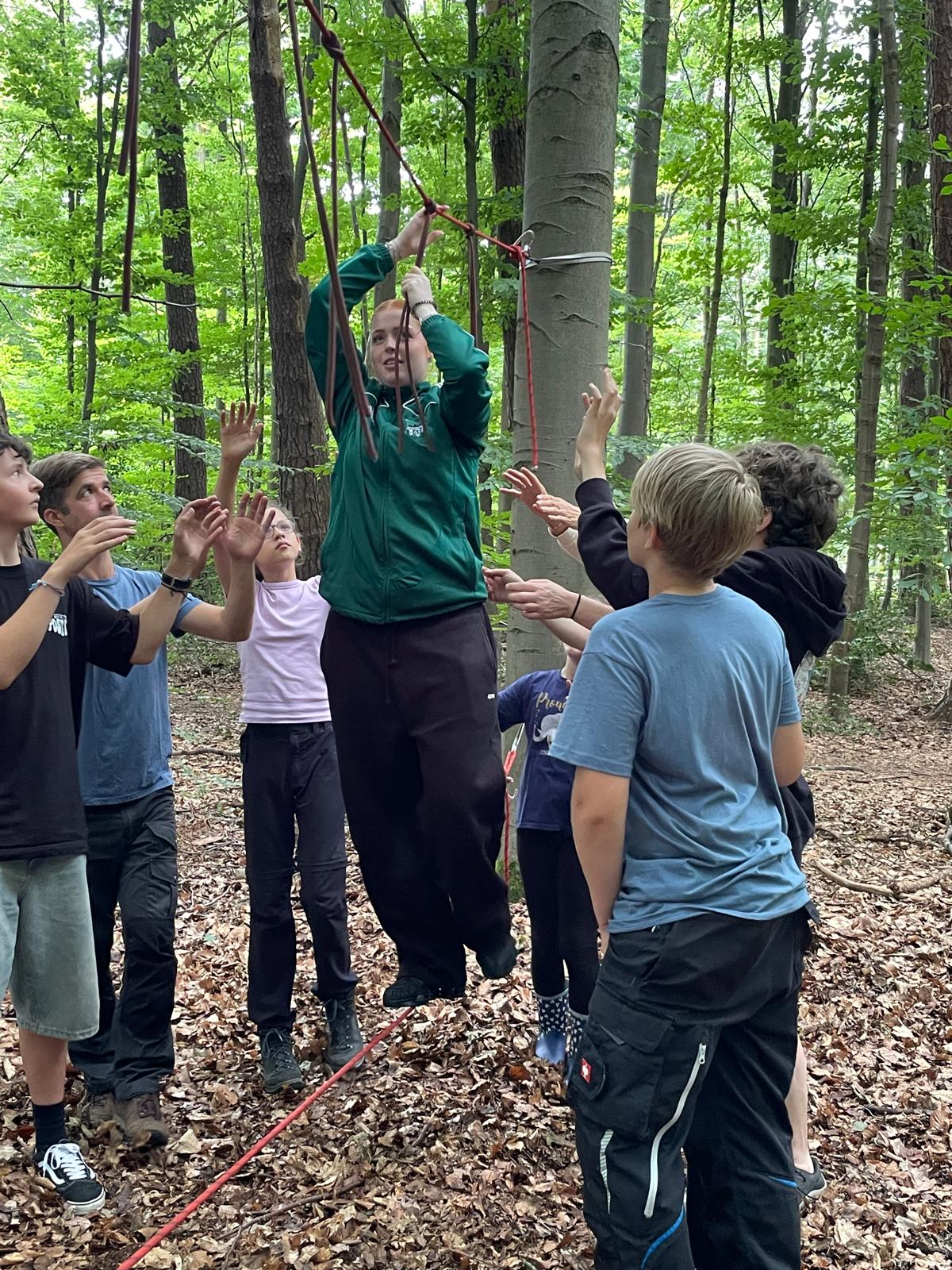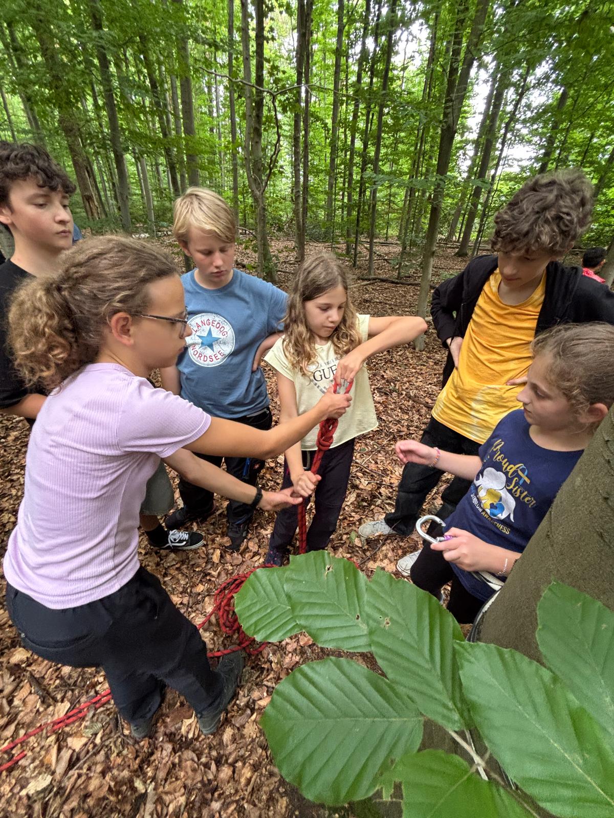 Am dritten Tag standen praktische Techniken im Mittelpunkt: Die Kinder lernten Knoten und den Umgang mit Seilzügen und setzten ihr Wissen direkt um. Der neue Parcours im Wald wurde gemeinsam geplant und gebaut – mit viel technischem Know-how.