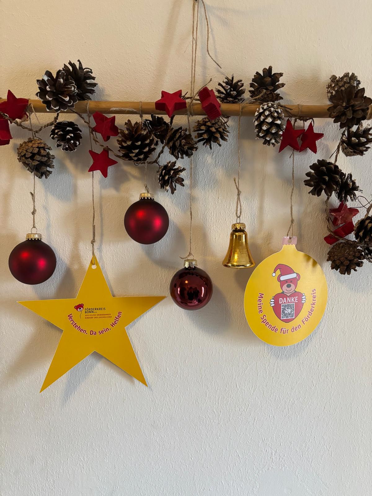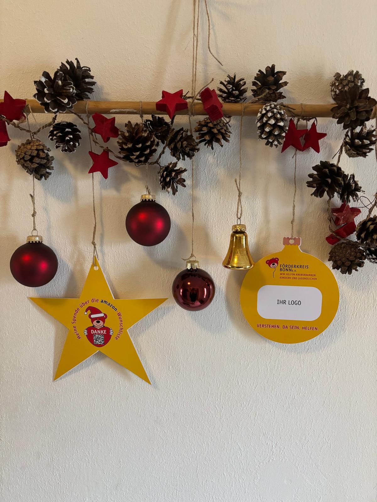 Weihnachtskugeln mit Spenden-QR-Codes und Sternen mit einem Link zu unserer Amazon-Wunschliste .